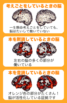 なぜ音読が脳を活性化させるのか 画像を見て下さい。これが私が実証した、脳の様子です。黄色やオレンジ色になっている部分が、脳の中で活発に働いている場所で、オレンジ色よりも黄色のほうが、より活発に働いていることを示しています。この画像から見てもわかるように、人間はふだん脳を100%使っているわけではなく、むしろ使われていない部分のほうが多いくらいなんです。しかし音読をすると、他の様々な行動に比べ、最も多くの脳の部分が、同時に、そして活発に働くのです。 (「昔ばなしを音読するだけで頭がよくなる理由」より) |
