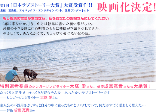 沖縄の離島・与那喜島で、雑貨商を営みながら淡々と暮らしている友寄明青(35)のところに、ある日「幸」と名乗る女性から便りがやってきた。明青が旅先の神社に、ほんの遊び心で残した「嫁に来ないか」という言葉を見て、手紙を出してきたのだ。「私をお嫁さんにしてください」幸からの思いがけない手紙に半信半疑の明青の前に現れたのは、明青が見たこともないような美らさんだった。幸は神様がつれてきた花嫁なのか?戸惑いながらも、溌剌とした幸に思いをつのらせる明青。折しも島では、リゾート開発計画が持ち上がっていた。反対する少数派だった明青も、幸が一緒なら新しい生活に飛び込んでいけると思い、一大決心をする。しかし幸には、明青に打ち明けていない秘密があった――。