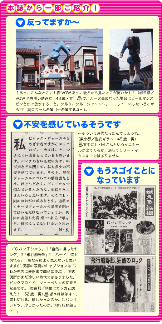 | ★ビンテージな'60~'70年代FOLK&ROCKネタ! ★もちろん最新POPネタも! ★「対自核」って何?“メタルゴッド”伊藤政則דロンナイ”大貫憲章「輝け!トンデモ邦題大賞」 ★清水ミチコ「顔マネ塾」シーナ(シーナ&ロケッツ) ★未映子(創作歌手)×穂村弘対談 ★大島渚、勝手に観光協会、ほかVOW POP名盤ガイド! |