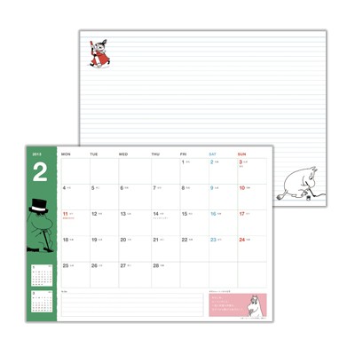 北欧生まれの大人気キャラクター「ムーミン」の2013-2014年のダイアリーが登場です。2013年2月始まりのマンスリータイプのスケジュール表に、ムーミンのキャラクター紹介やフィンランド語講座など、盛りだくさんのコンテンツです。人気ブランド「ニーム」とコラボした、キュートなピンクのボーダー柄のカバーデザインは、走るリトルミイがポイント。カバーポケットからひょっこりのぞくムーミンと、リトルミイのプリントも注目です。