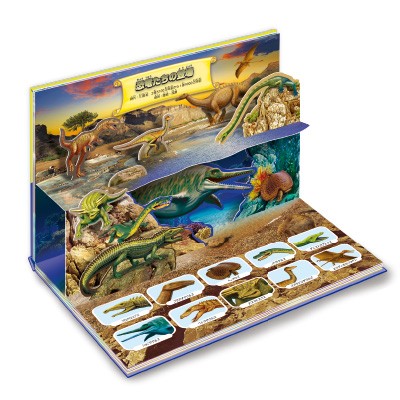 ロシアの出版社「AZ BOOKS」から発行されている音声モジュール付きポップアップ絵本の日本語版です。すでに発売されている類書の判型は170×150mmが多いですが、本書は300×215mmと大判で、類書の2倍以上の大きさで迫力があります。また見開きも8見開きあり、そのうち、飛び出すしかけがあるページは4見開きも!恐竜の詳細な解説も載せ、単純な視覚で楽しむ絵本ではなく図鑑としても大活躍の一冊です。