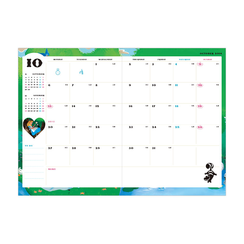大人気ディズニーの「不思議の国のアリス」より2015年手帳が登場! 紺地に金色で箔押しを施した高級感のあるカバーと、たくさんのイラストでアリスの可愛らしい世界観を表現した中身がマッチして魅力的な仕上がりに。2014年10月~2016年3月までのマンスリーは、見開き1カ月タイプなのでいっぱい書き込めます。ノートにはアリスの物語を可愛いイラストとともに紹介。また罫線タイプと方眼タイプの2種類をそろえているので、用途に合わせてメモを取ることができます。巻末には緊急時のメモや、全国の主要都市の鉄道路線図を収録しています。絵本の世界に入り込んだような楽しい毎日を演出してくれる手帳です。