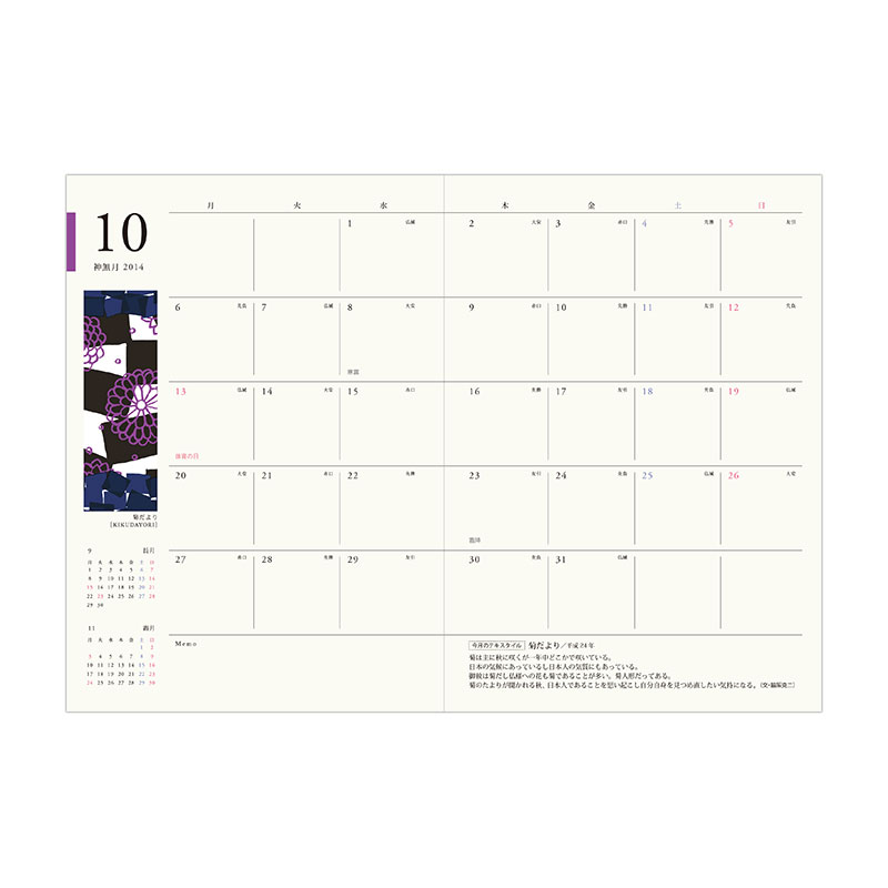 京都発のテキスタイルブランド、SOU・SOU(そう・そう)のマンスリー&ウィークリー手帖が登場。カバーは、SOU・SOUの代表的テキスタイル「SO-SU-U」。四季を感じさせるテキスタイル満載のマンスリーページ、SO-SU-U柄のノートページ、SOU・SOUのテキスタイルデザイナー、脇阪克二さんによる京の歳時記など、シンプルで使いやすいレイアウトのすてきな手帖です。2014年10月から2015年12月まで使えます。