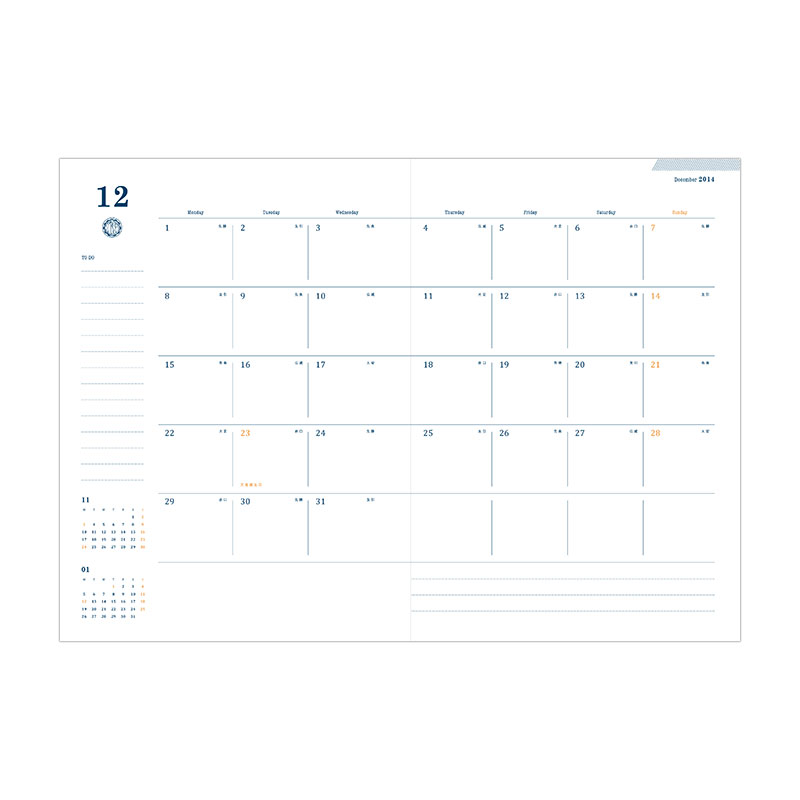 トラッドテイストが人気の「BEAMS BOY」から、ビジネス手帳が登場しました。毎日使う手帳だからこそ、本革のような素材感にこだわったカバーに、この秋人気のカレッジテイストなエンブレムを型押ししたシンプルなデザイン。この秋のキーカラー、キャメルを基調とした男女問わず使えるユニセックスでおしゃれな仕上がりです。ビジネスシーンに活躍する2014年12月~2016年1月までのマンスリー&ウィークリーと、全国主要都市の鉄道路線図や世界地図、緊急連絡先リスト、贈答のマナーなど便利なお役立ちページも収録。おしゃれなBEAMS BOYの手帳らしく、ファッション用語や洗濯記号の一覧、使いやすい方眼ノートなども必見。2015年の手帳はぜひこちらで!