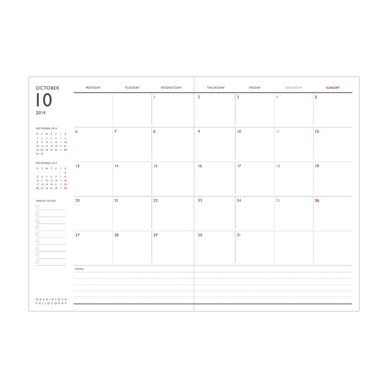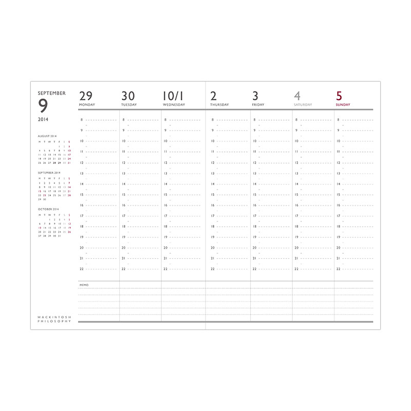 英国を代表するブランド「マッキントッシュ」のセカンドライン、「マッキントッシュ フィロソフィー」のダイアリー。クラシックなレザー調のカバーデザインがシックな印象です。中身は、2014年10月~2016年12月までのマンスリーページと、2014年10月~2015年1月までのウィークリーページ、世界地図、地下鉄路線図、手紙のマナーなどが収録されています。ウィークリーページは時間ごとの予定が書きやすい、1週間見開きのバーチカルタイプで、細かい時間管理が必須な方にぴったりです。