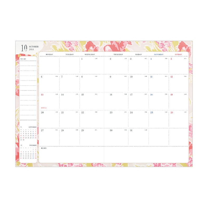 人気ブランド、レストローズの手帳が、汚れにくいPVCカバーで登場。パープルを基調とした花柄で、大人でも使いやすいかわいさ。ブランドのテキスタイルを使用したオールカラー96P。2014年10月~2016年3月のマンスリータイプで、シンプルにスケジュールを管理できます。メモページ、路線図や緊急時などのテレフォンガイド付き。