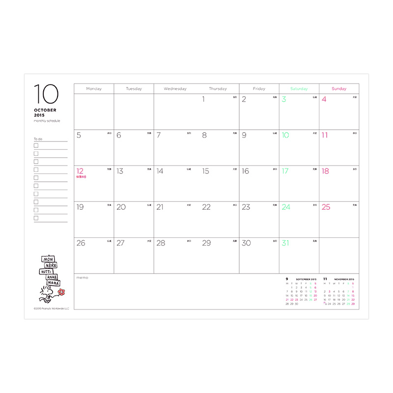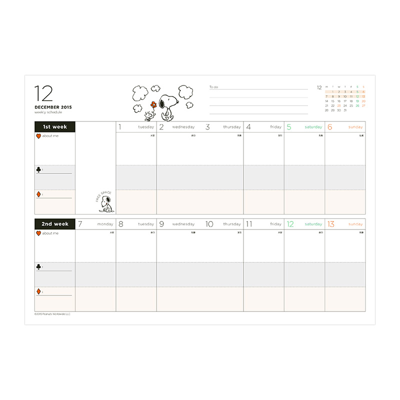 スヌーピーと仲間たちのキュートなイラストいっぱいのファミリー向けダイアリーの登場です。使いやすさにこだわった見開きのマンスリーページに加え、ウィークリーページは家族の予定をそれぞれ書き込める仕様なので、一冊で家族みんなのスケジュール管理ができます。フリーノートページに加え、路線図や贈答リストなどの便覧も充実。対応期間は2015年10月~2017年3月、サイズは持ち運びにも最適なB6サイズです。