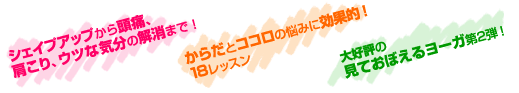 冷え性を改善したい…英雄坐のポーズ 腰を強くしたい…ラクダのポーズ 肩こりを和らげたい…アーチのポーズ 目の疲れを和らげたい…スキのポーズ 頭痛を和らげたい…うさぎのポーズ 生理痛を軽くしたい…開脚前屈のポーズ 鼻炎を改善したい…浄化法 |