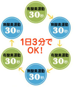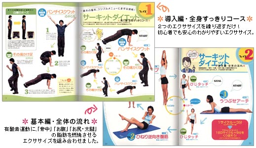 アメリカ発の画期的なダイエット サーキットダイエットは“肥満大国”アメリカで生まれた、ダイエット方法。「140kgあった体重が1年半で、およそ半分の65kgまで減った」など実績が話題を呼び、今や“流行”ではすまされない“スタンダード”となっているダイエット方法です。本来は、ジムで専用のマシンを用いて行うものですが、本書では日本のサーキットダイエットの第一人者・饗庭秀直先生が考案した、“マシンとほぼ同じ効果が得られるエクササイズ”によって行います。 サーキットダイエットの仕組み では具体的にどういう運動を行うのかというと、とてもシンプル!「有酸素運動と無酸素運動を30秒ずつ繰り返すだけ!」。有酸素運動は、酸素を体内に取り入れることで、脂肪を燃焼させる運動。ただし、運動強度が低いため20分以上続けないと効果が表れないといわれています。一方、無酸素運動は短時間で運動強度が上げられるものの、疲れの素・乳酸がたまりやすく30秒以上続けるのは困難。 そこで、両方のイイトコ取りをしたのがサーキットダイエットです。無酸素運動の30秒で運動強度を上げて、有酸素運動の30秒で脂肪を燃焼させる。この組み合わせにより、たった3分でみるみる脂肪を燃やすことができるのです。 |