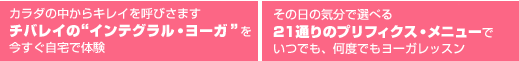 | 美容のため、ダイエットのため……と、ヨーガをはじめるきっかけは、なんでもOK。ヨーガは身体だけでなく、心までも強くし、そして磨くことができます。実際、私自身がヨーガをはじめたことによって、出産による体型の変化や育児ストレスなど乗り越えることができました。もちろん、日々のさまざまなプレッシャーや悩みは尽きないけれど、今では“幸せ”に感謝する毎日です。 ヨーガにはたくさんの流派があります。それらの技法をバランスよくとり入れ、インドのヨーガの伝統を基本としながら日本人向けにアレンジしたのが、「インテグラル・ヨーガ」。私は自分が体験したヨーガの素晴らしさを、ひとりでも多くの人たちに伝え、そしてみんなが幸せを手に入れてほしい、いつも笑顔でいてほしい、と思っています。 けれど、すべての人が教室に通えるわけではありませんよね。この本とDVDは、自宅でも気軽に“チバレイの個人レッスン”が受けられるように、そして誰が行ってもわかりやすい構成というのを第一に考えて作りました。 「ポジティブな気分」「カラダ引き締め」「リラックス」の3大テーマから、その日の気分や体調に合わせて21通りのメニューを実践できるのも特長のひとつです。心身ともに“キレイ”を手に入れて、元気でハッピーな毎日を送れますように♪ |