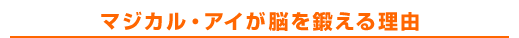 本書のイラストによる問題=マジカル・アイは、いろいろな仕掛けで、一般の生活ではおそらく使われることの少ない脳の部分に働きかけ、快い刺激を与えます。これらはいずれも、人が本来持っている脳の力を、見て楽しいことで「取っつきやすく」、答えが納得できることで「達成感を得やすく」、さらにそれらによって次に進もうという「やる気を引き出す」ことで高める問題となっています。