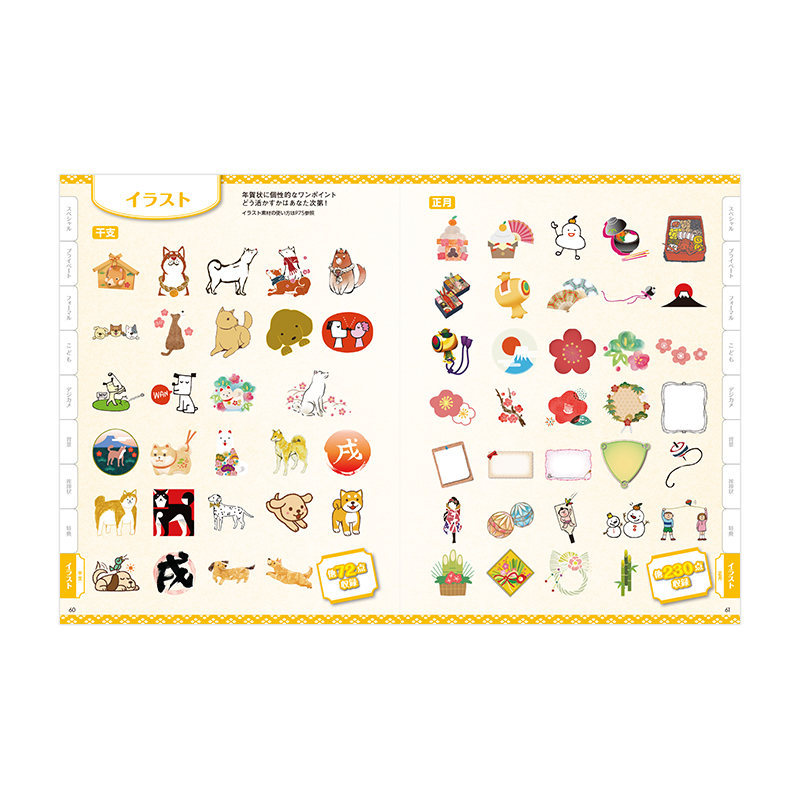 年賀状ムック8年連続売上No.1!オリジナル年賀状作成ソフト&宛名書きソフトつきの、家族みんなで使える充実のオールインワン年賀状作成素材集です。今年は誌面の各デザインに振られた番号を入力して一発で検索できる機能を搭載し、使いやすさがぐーんとアップ!12年に1度の主役年、大人気のアイドル犬「俊介くん」年賀状や、SNSで大人気のワンちゃん年賀状、絢爛豪華なゴールド年賀状など、4700点の圧倒的素材を収録しました!