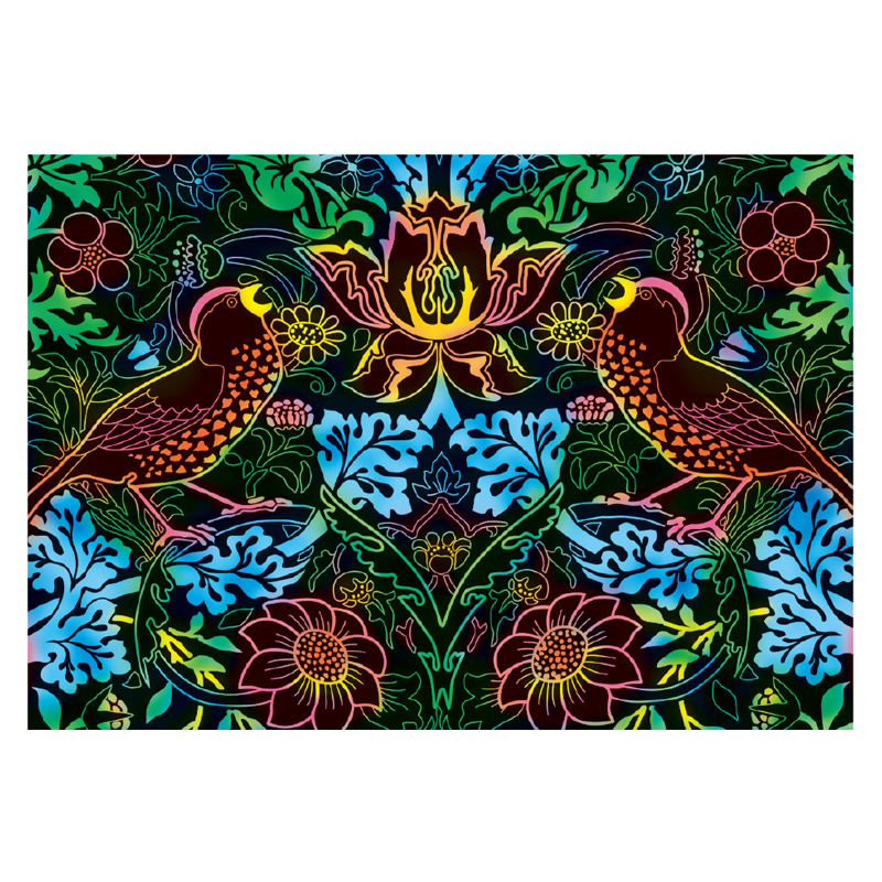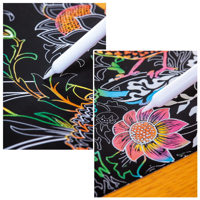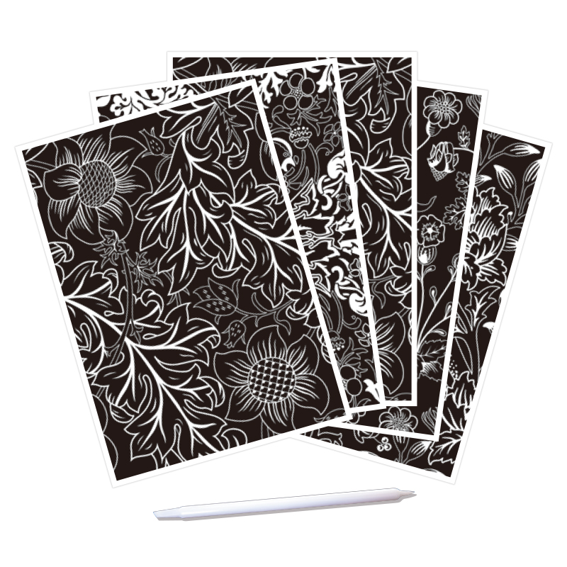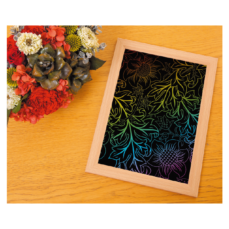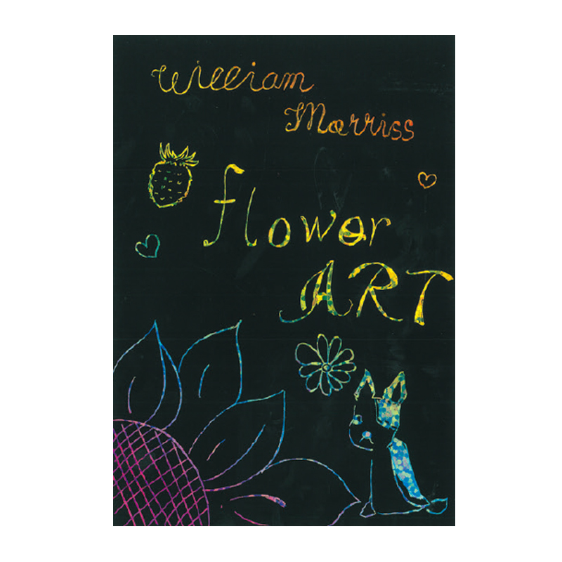 スクラッチアートはアメリカ発の新しい絵描き技法で、黒いスクラッチ面を削ると出てくるホログラムや虹色の線で描くアートです。本誌では、人気デザイナーであり画家であったウィリアム・モリスの花の絵柄をスクラッチしていきます。スクラッチアートの楽しみ方、モリスの作品集等を収録したムック本に、モリスのイラストを削り描きできる5枚のシート+自由に削り描きを楽しめる無地シート1枚が付属します。
