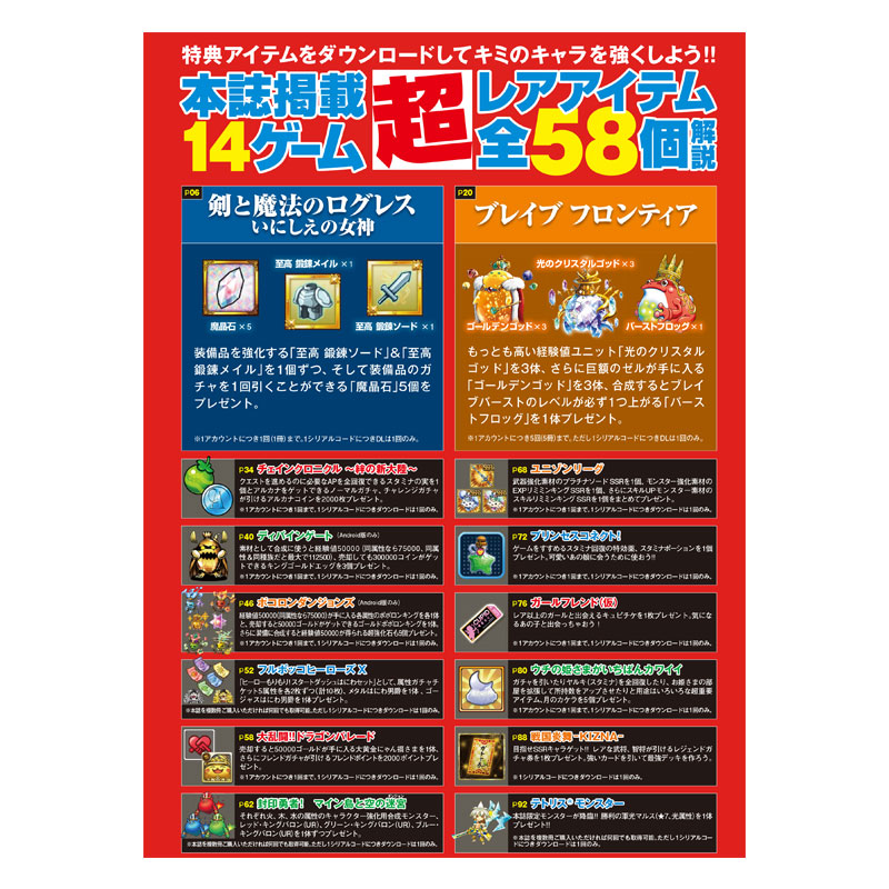 人気沸騰中の『剣と魔法のログレス いにしえの女神』と『ブレイブフロンティア』をはじめとした、今話題のアプリゲームを一挙紹介します!! さらにスタートアップガイドやゲーム攻略情報などを初心者にもわかりやすく丁寧に解説した一冊です。
