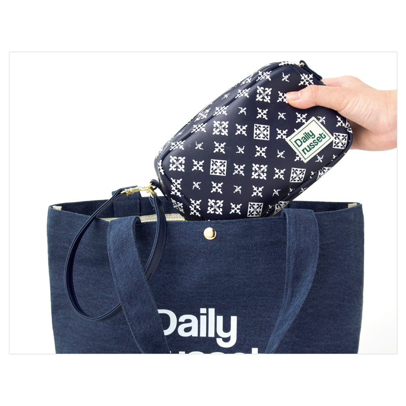 大人気雑貨ブランド「Daily russet(デイリー ラシット)」のブランドムックが登場!付録は、飽きのこないシンプルなデザインが魅力のネイビーのロゴバッグとモノグラム柄ポーチの豪華2点セット。ポーチは、2種類のストラップつきなので、バッグインバッグとしてはもちろん、ショルダーバッグとしても使える優れものです。誌面では、Daily russetの秋冬の新作をたっぷりとご紹介します。