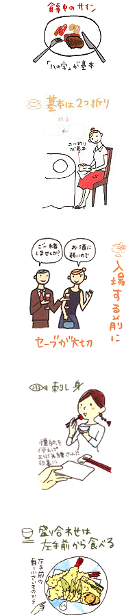 | 洋食のマナー ◎事前に知っておきたいマナー ◎ナプキンの使い方 ◎洋食のテーブルセッティング ◎フルコースのメニュー ◎オードブルの食べ方 ◎スープの飲み方 ◎パンの食べ方 ◎ソースの使い方 ◎フルーツの使い方 ◎イタリア料理のコース ◎ピザの食べ方 ◎パスタの食べ方 ◎フランス料理の食べ方 ◎ビュッフェ・パーティーのマナー ◎レストランで使える用語集 …ほか 和食の作法 ◎事前に知っておきたい作法 ◎会席料理のコース ◎そばの作法 ◎てんぷらの作法 ◎寿司の作法 …ほか 中華料理の作法 ◎円卓でのふるまい ◎中華料理のコース ◎中華料理の食べ方 ◎ひと手間かかる料理の食べ方 …ほか 韓国・台湾・タイ・ベトナム料理のマナー 韓国 ◎韓国料理のコース ◎韓国料理の食べ方 台湾 ◎台湾料理の食べ方 タイ ◎タイ料理の食べ方 ベトナム ◎ベトナム料理の食べ方 …ほか お酒のマナー ◎ワインの種類 ◎ワインの選び方 ◎ワインの飲み方 ◎焼酎の飲み方 ◎ウイスキーの飲み方 ◎バーでのマナー …ほか 食材別の食べ方と飲み方 ◎体にやさしい食材 ◎鍋ものの食べ方 ◎全国の名産の食べ方 ◎コーヒーの飲み方 ◎洋食器の種類 ◎和食器の種類 …ほか シーン別のマナー 披露宴/葬儀/行事/ビジネス/訪問 |