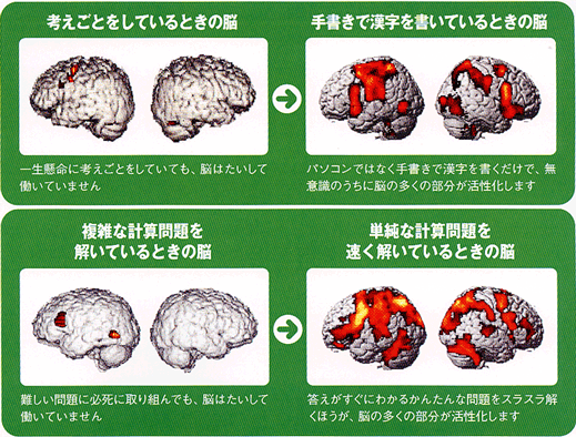 ●「漢字を書く」「単純計算を速く解く」という行為をすると、脳全体が活発に働きます。考えごとをしていたり、複雑な計算問題を解いているときは、意外なことに脳はほとんど働いていません。