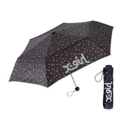 ストリートでダントツ人気のブランド、X-girlの折りたたみ傘が登場!黒地にパステルカラーの星とイナズマが映えるカッコかわいい柄は、ここでしか手に入らないスペシャルデザイン。傘、傘袋の両方に大きく入ったシルバーのロゴもポイントになっています。傘は人気の3つ折りタイプでコンパクトに持ち歩け、雨傘としても日傘としても使える(UVカット率93%)ので、いつもバッグの中に入れておきたい!X-girlの2013年夏の新作が見られるスペシャルブックレット入り。