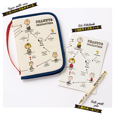 パスポートや通帳ケースとしても、B6サイズのノートや手帳のカバーとしても使える「スーパーマルチケース」と、「ノート」「ボールペン」の3点セットを、スヌーピーとミルクフェドの強力タッグでお届けします。マルチケースは、カードポケットやファスナー付きポケットも付いていて、小分け収納もおまかせ。珍しいキャラクター相関図をモチーフにしたデザインが自慢です。このマルチケースにセットできる、単独でも使えるB6サイズのノートは、開くとミルクフェドのロゴがON。黒インクのボールペンは、ゴールド使いでリッチな仕上がりです。日々の生活がちょこっと楽しくなる、大人のための3点セットです。