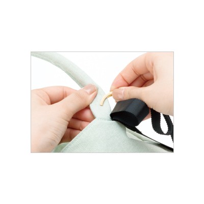 リボンチャームの金具の取りつけは、持ち手の芯のすぐ下のところで、生地をつまむように後ろからはめてください。リングは回すようにゆっくり押し込んでください。