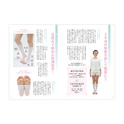 “第二の心臓”といわれるふくらはぎ。下半身にたまりがちな体液(血液とリンパ液)を放っておくと、血行不良の原因となり、腰痛・便秘・冷え性・神経痛・生理不順などの様々な病気を引き起こします。そんな滞りがちの体液はふくらはぎをマッサージすることで改善します。大谷由紀子先生監修の「ふくらはぎマッサージ靴下」は着圧効果があるので、履くだけでふくらはぎのポンプ機能を活性化させ、体調も改善。また、足裏にクッションがついているので、ツボ刺激効果もあって気持ちよくお使いいただけます。