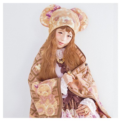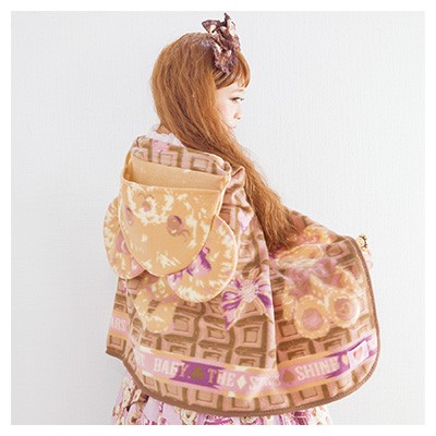 お姫様を夢見る女の子の憧れブランド、『BABY,THE STARS SHINE BRIGHT』の人気キャラクター“くまくみゃちゃん”がフード付きのフリースブランケットになりました。ミルクティー色のくまくみゃちゃんのフードが付いたスイーツ柄のかわいいデザイン。ボタンをとめればマントのように着ることもできるので、お部屋や職場で肌寒いときに羽織るのにも最適です。くまくみゃちゃんがやさしく包んでくれる癒しのブランケットです。