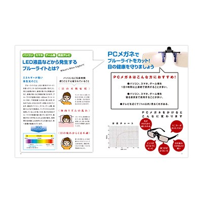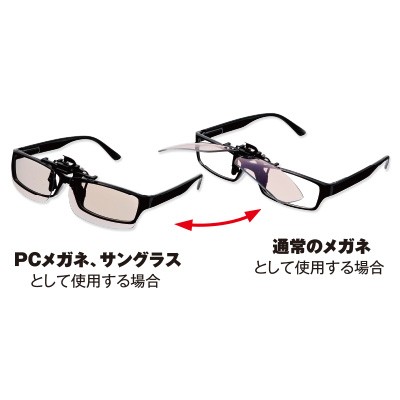 お手持ちのメガネにつけるだけで「跳ね上げ式のPCメガネ」に早変わりするクリップオンタイプのPCメガネです。割れない高級・安全レンズを採用。ブルーライトをカットし、目を守ります。ブランドメガネケース付き。