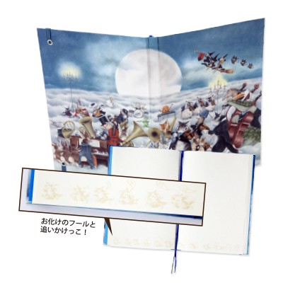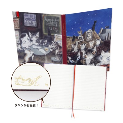 「猫のダヤン」の高級ノート2冊セットです。中ページには上質紙を使用し、ハードカバーにゴムバンドをセット、2本のしおり紐も付いています。フランス・パリを舞台にした人気のイラスト『パリの夜に歌うよ』を表紙に、『パリのカフェ』を裏表紙に使用したノートは、罫線つきでお勉強やお仕事に最適。ダヤンたちが雲の上で音楽を奏でる幻想的なイラスト『月に聞かせる音楽会』を表紙から裏表紙にかけてレイアウトしたノートは、無地なので自由に書き込むことができます。2冊とも中ページ下部にダヤンのイラストをプリントしたこだわりの仕様です。