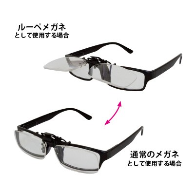 お手持ちのメガネに付けるだけ!跳ね上げ式のルーペメガネに早変わり!年をとるごとに視力が弱まり、さまざまな場面で小さい文字が見えにくくなってきて苦労している方々に向けた、メガネに付けられる拡大鏡です。小さい字を読むときはもちろん、手芸など細かい作業時にも役立ちます。