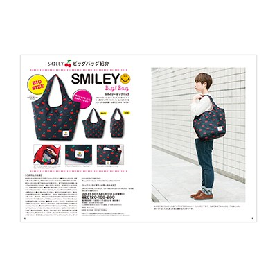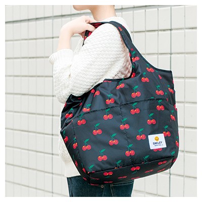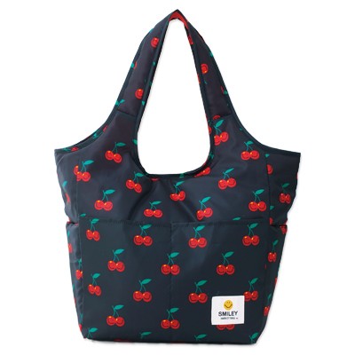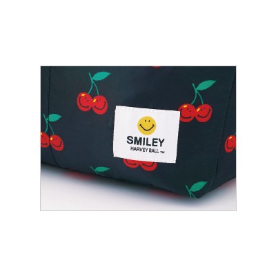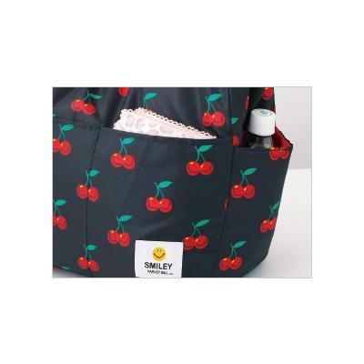 世界中で愛されつづける、スマイリー(ニコちゃんマーク)生誕50周年を記念して、ふかふかの中綿入り、たっぷり収納のビッグバッグが登場しました!チェリー柄のキュートなデザイン、よく見るとチェリーがスマイリー・フェイスになっています。外ポケットが5つに内ポケットが3つも付いて、荷物が多い人にもうれしい多機能バッグです。中綿入りなので、壊れやすいものを入れても衝撃をやわらげてくれます。ちょっとした小旅行にもおすすめ!