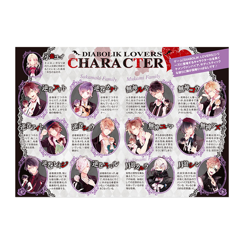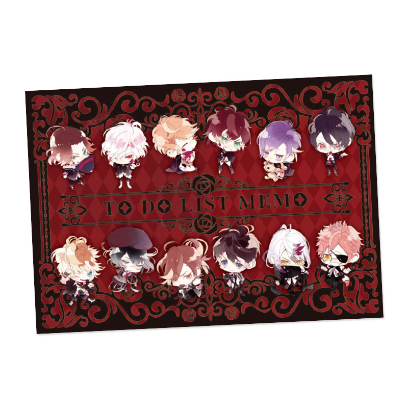 常にヴァンパイア兄弟たちのおそばにいられる、“チチナシ”のお嬢様方必携グッズが完成しました。情熱的な限定デザインのCDケース、逆巻兄弟からの書き下ろしお褒めの言葉つきのTO DO LISTメモ帳、血の色のラメとテディを閉じ込めたフロートボールペン、逆巻兄弟のダイカットクリアブックマークの豪華4点セットです。