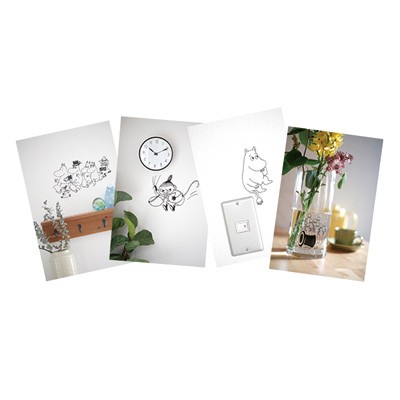 大人気キャラクター「MOOMIN」のウォールシールが登場です。ムーミンやスナフキン、リトルミイなどおなじみのキャラクターたちがA4サイズのウォールシール4枚にたっぷり15点入っています。大小さまざまなシールがあるので、壁に貼って部屋をイメージチェンジしたり、電気のスイッチまわりに貼ったりと、使い方はさまざま。原作者のトーベ・ヤンソンが、今年、生誕100周年を迎え、ますます話題のMOOMINのマストアイテムです。
