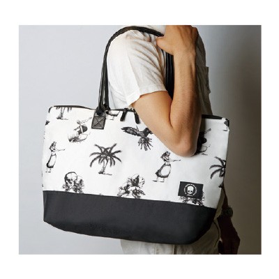 数多くのミュージシャンやファッショニスタから支持されるブランド「Roen(R)」のトートバッグです。バッグは1泊旅行やジム通いにも対応できる超ビッグサイズ。ダブルファスナー仕様で使い勝手もバツグンです。スカルをモチーフにしたアロハ調のグラフィックを採用し、レジャーにもピッタリ。タグ部分にブランドのアイコンといえるスカルのサークルロゴをプリントしています。スペシャルブック(8ページ)付き。