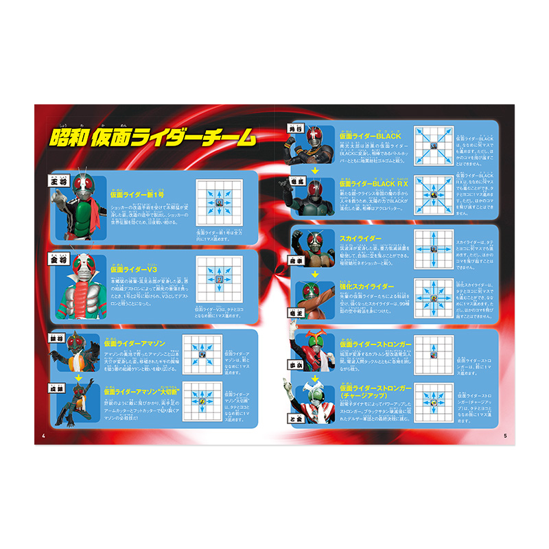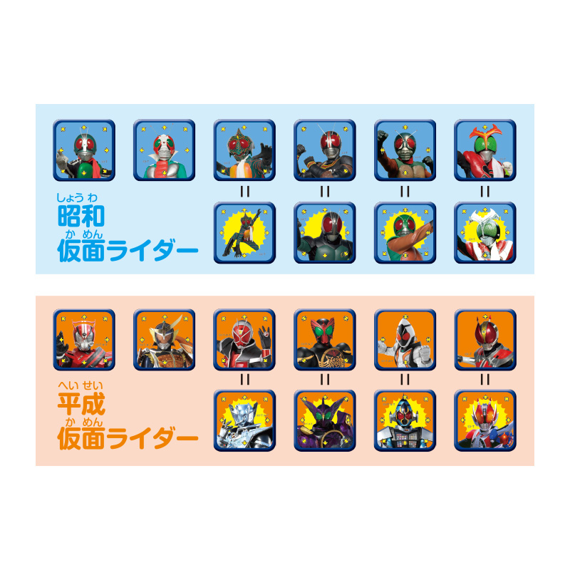 「考える力」を育む「将棋」に歴代の仮面ライダーが大集合!2014年のライダー「仮面ライダードライブ」率いる平成 仮面ライダーチームと、初代「仮面ライダー新1号」率いる昭和 仮面ライダーチームが盤上で競います。お気に入りのライダーを勝たせられるか否かはプレーヤー次第。夢中で遊びながら脳力アップできる一石二鳥のゲームです。