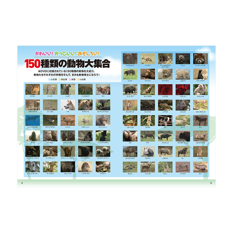 全150種類の動物を貴重な映像とナレーションで解説したDVDです。百科事典等では伝えることができない、動物たちの実際の動きなどを見ることで理解を深めることができます。それぞれの動物の紹介を1分以内に凝縮しているので、飽きずにテンポよく150種類の動物たちの生態を知ることができます。子供から大人まで動物に対しての興味と知識を深めてもらうために、できる限り多くの動物を収録しました。価格は百科事典のような高価格ではなく、衝動買いできる価格に抑えています。