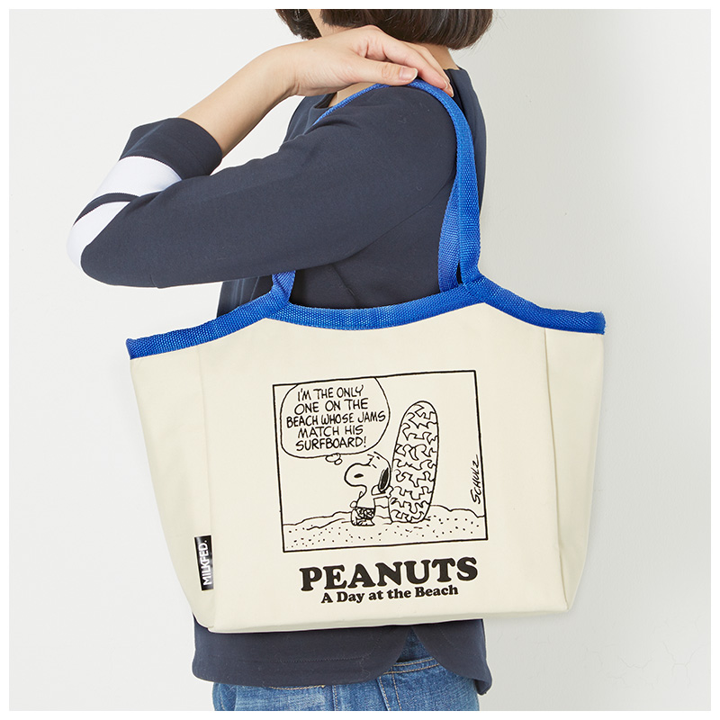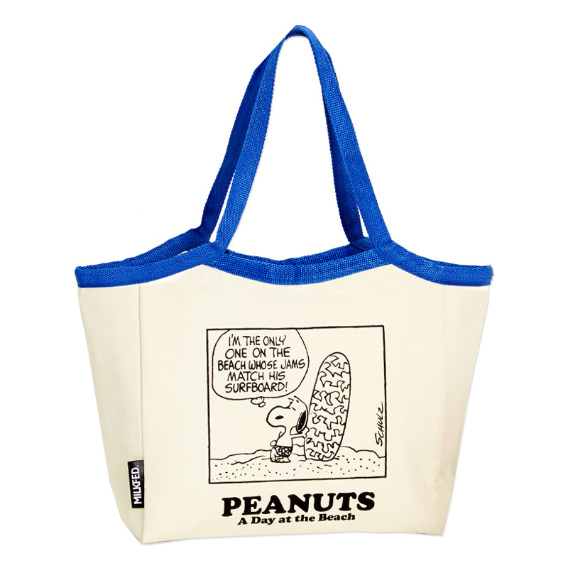 今年誕生65周年を迎え、12月には初の3Dアニメ映画が公開されるなど、さらに話題となりそうなスヌーピーとアパレルブランドMILKFED.のコラボ保冷バッグです。大きめ横長トートタイプでマチありなので、ペットボトルのドリンクやランチボックスなど、荷物をたくさん入れることができます♪ 砂浜でサーフボードを持ちポーズを決めるスヌーピーのプリントがとってもキュートでおしゃれ。しかも、内側には保冷剤を入れられるポケット付き。オフホワイト×ブルーのさわやかな配色だから、大人の女性や男性でも持ちやすいデザインです。