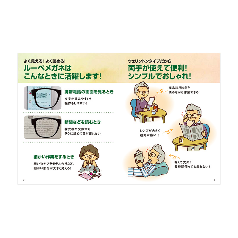 年をとるごとに視力が弱まり、家や会社などで新聞や資料、レポートなどを読む度に小さい文字が見えにくくなってきて、大変苦労している方々に向けた、仕事や家事、手芸作業などの趣味にも使える、ハンズフリーの拡大鏡です。フレームはどんな方にも似合うシンプルでおしゃれなウェリントンタイプです。