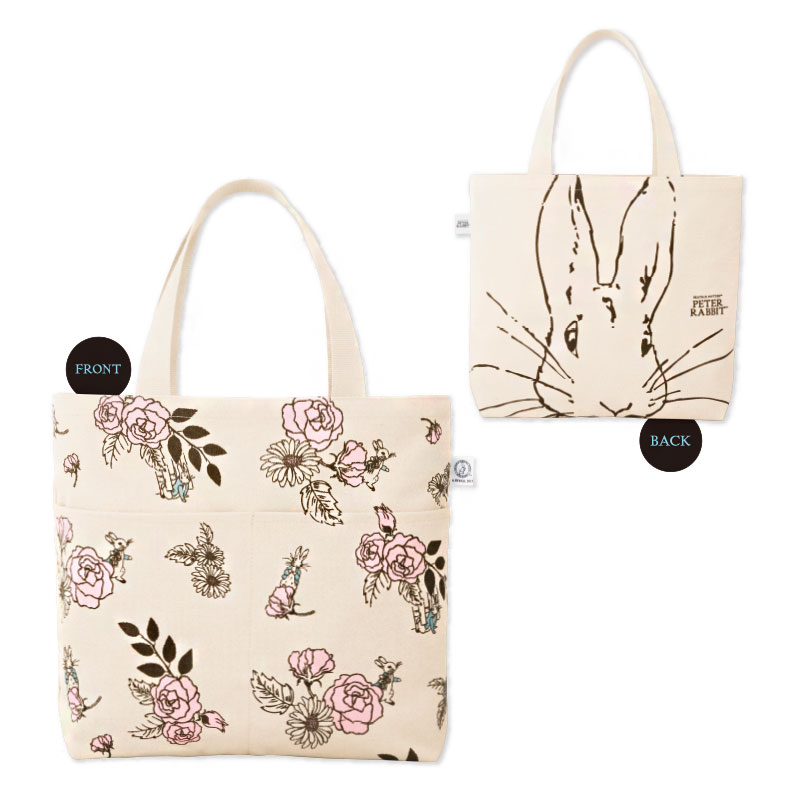 世代を超えて愛されるキャラクター、ピーターラビットのキュートなビッグトートができました!フロントには大きな2つのポケットがついていて、機能性・デザイン性ともにバツグン。ナチュラルな風合いで大人かわいいバッグは、片面はバラから顔をのぞかせるピーターの総柄、もう片面はバッグからはみ出すほどのビッグフェイスと、2つの異なるデザインが楽しめます。丈夫で大容量なので、お買い物やお出かけに大活躍間違いなし!