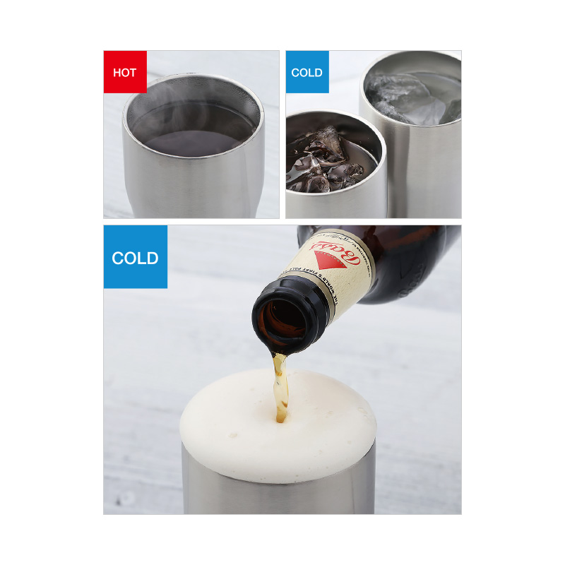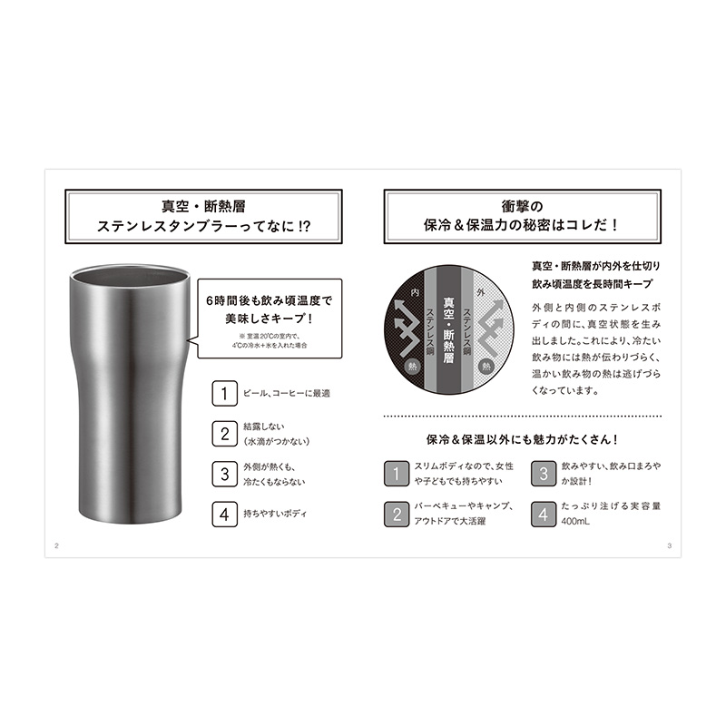 ビールをず~っと冷たいまま飲める、魔法のステンレスタンブラーが登場!飲み物の氷が6時間後も消えずに残るという、驚異の保冷力を誇ります。ビールや焼酎、ジュースはもちろん、ホットコーヒーやスープなどの温かい飲み物の温度も長時間キープしてくれます。水滴がついてボディが濡れることもないため、ご家庭はもちろん、仕事中、勉強中のデスクでもお使いいただけます。驚きの価格は……本体999円+税!!