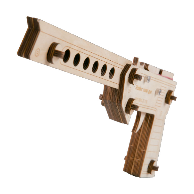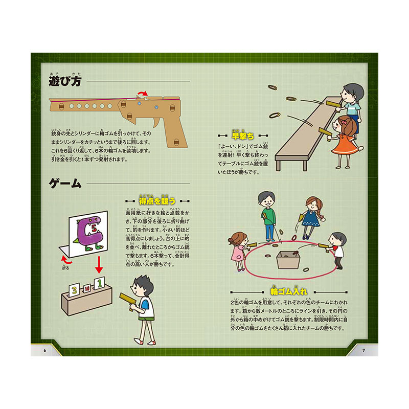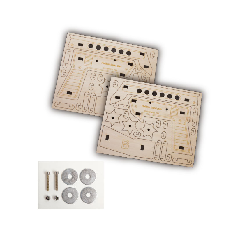 割り箸で作るのが定番の「ゴム銃(ゴム鉄砲)」が、進化して登場!一度に6本の輪ゴムを装填・連射できるセミオートのゴム銃です!木製のボディを自分好みにカラーリングすれば、楽しく遊べてお子さまの育脳にもつながります!付属の冊子では、ゴム銃の組み立て方はもちろん、親子やお友達と楽しめる遊び方もご紹介しています♪