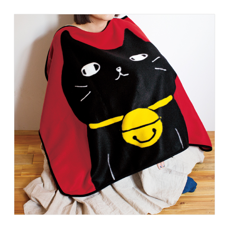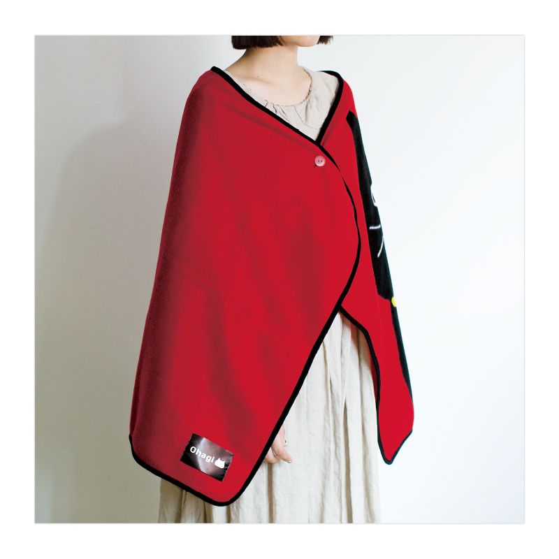 大きな鈴がトレードマークの「ねこのおはぎちゃん」のブランケットです。おはぎちゃんは、おはぎを食べ過ぎてどっしり体形に。スリムなねこにやきもちを焼いたり、ひねくれてたりするけど、本当は心の優しいねこです。詳しくは同梱のブックレットに書いてあるので、ぜひチェックしてみてください。おはぎちゃんの顔が大きくプリントされた、存在感のあるデザイン。上部のボタンを留めれば、ポンチョ風にも使えるうれしい2way仕様。