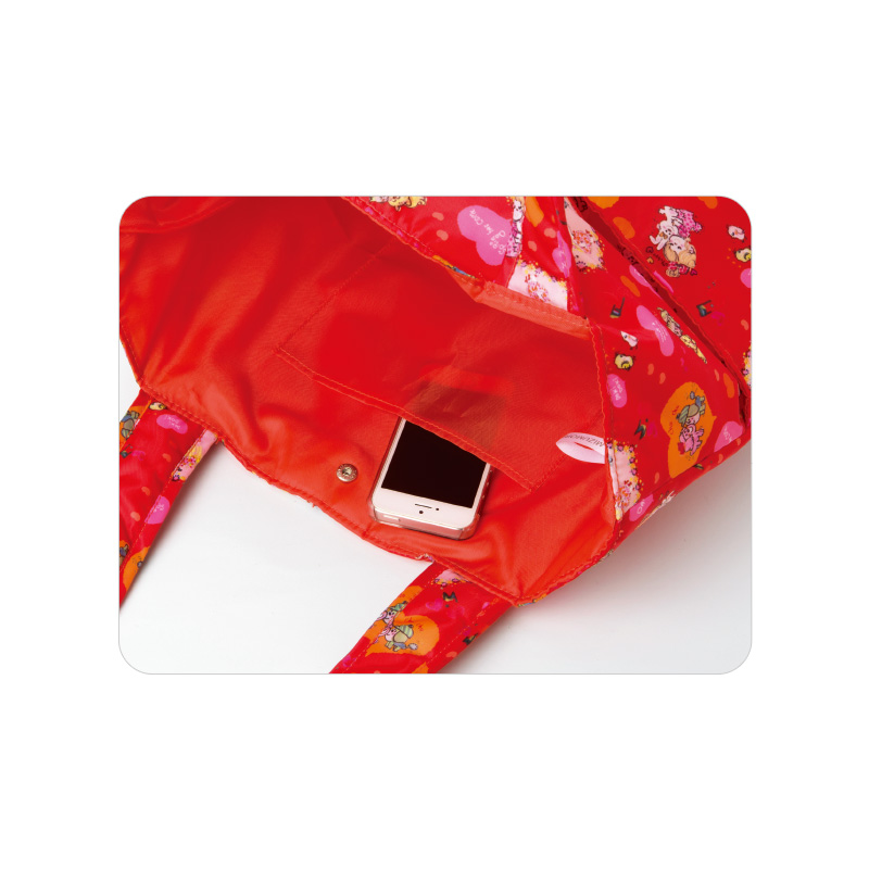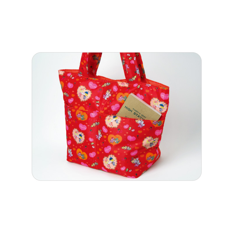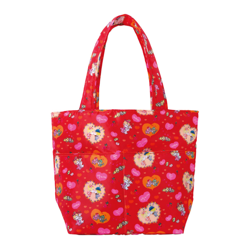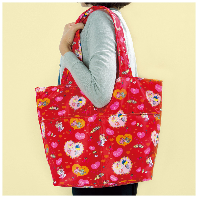 大人気・亜土ちゃんのキュートなショッピングバッグが登場です!レトロ可愛い赤色に、「LOVE」なイラストがたくさん詰まった本誌限定オリジナルデザイン。ふわふわの中綿入りでとっても軽く、ビッグサイズで大容量なので、荷物が多くても安心です。フロントには大きなWポケット、バックにはチャック付きポケット、さらに内ポケットもついて機能性もバツグン。毎日のショッピングに、ちょっとした旅行に、スポーツに、マザーズバッグにと大活躍間違いなしのアイテムです!