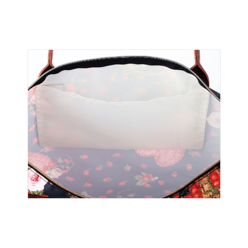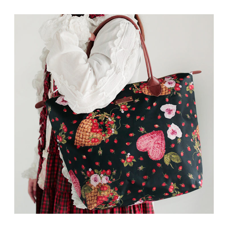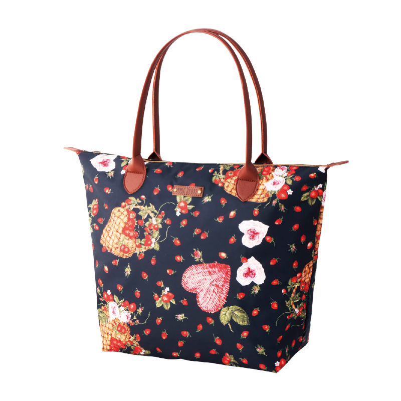 ロマンティックな柄をプリントしたポリエステル生地に、合皮の持ち手を組み合わせた、大人も持てる可愛さのトートバッグが登場。ハート形のバスケットから溢れるたくさんのベリーとフラワーが愛らしいベリーベリーローズ柄。ファスナー付きでちょっとした旅行にも便利です。本革を使用したブランドタグがポイント。