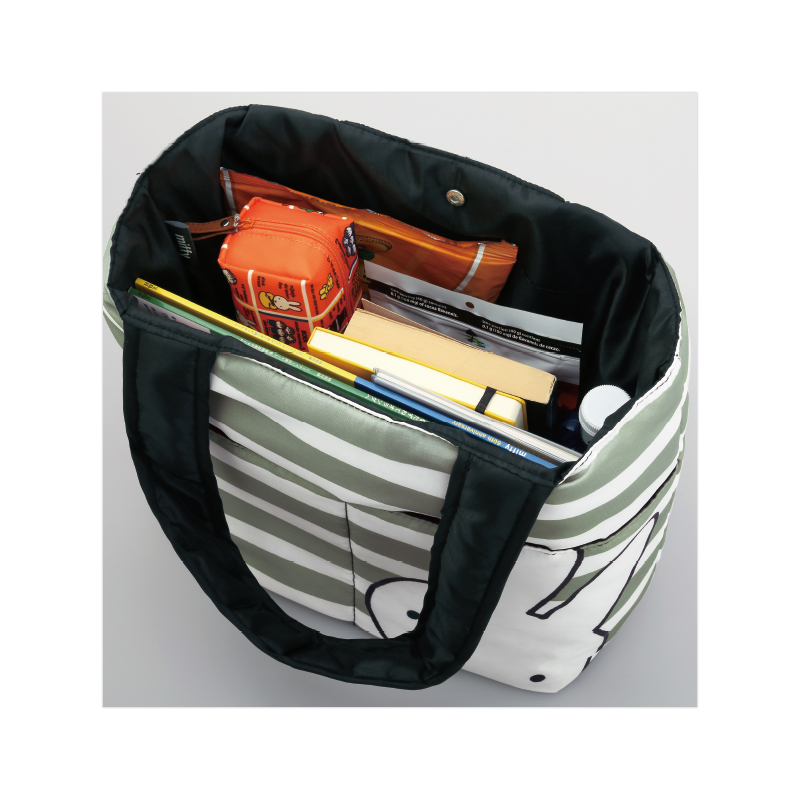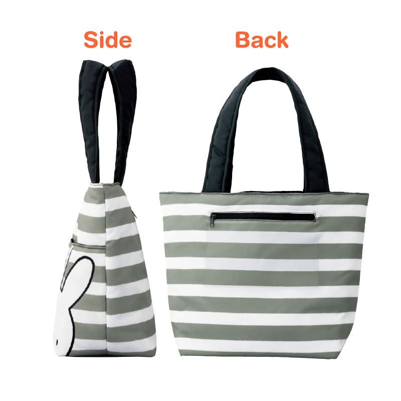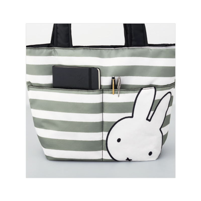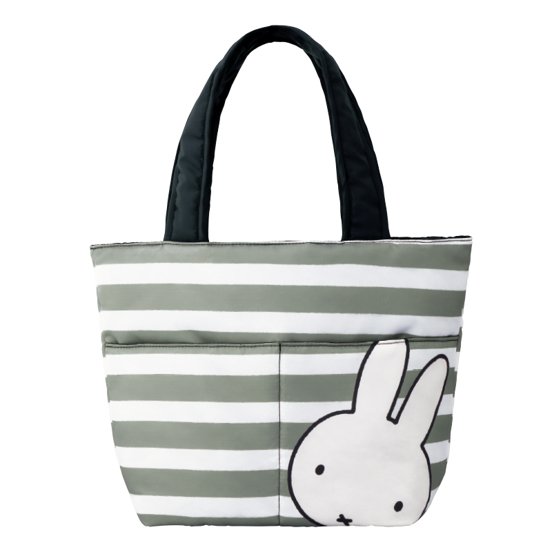 2015年、60周年を迎えたミッフィーの特製ショッピングバッグが登場です!やさしいグレーのボーダーに、ミッフィーのビッグフェイスがシンプルでかわいい、本誌限定デザイン。中綿入りでふわふわと手触りもよく、ビッグサイズなのにとっても軽いので、荷物が多くても安心です。フロントには大きなポケットがふたつ、後面にはファスナーポケット、さらに内ポケットもついているので小物の整理もバッチリ。毎日のお買い物やお出かけに、いつでも持ち歩きたくなるうれしいアイテムです。