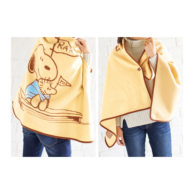 スヌーピーとウッドストックのイラストが可愛すぎる、ふわふわあったかなフリースケープの登場です。フロントをボタンで留められるから、肩からずり落ちなくてとっても快適♪オフィスでもプライベートでも、シーンを選ばず使えます。軽いので、折りたためば持ち運びもラクラク。寒い時期に手放せない一枚になること間違いなしです!
