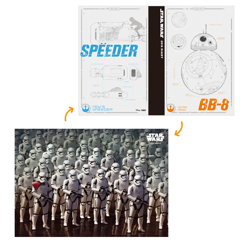 スター・ウォーズファン待望の2015年12月最新作「フォースの覚醒」デザインのマンスリー手帳がついに登場!カバーは今回の映画に初めて登場するBB-8&スピーダーと、おなじみのストームトルーパーの2パターン楽しめるリバーシブルデザイン。マンスリーページにはもちろん「フォースの覚醒」のキャラクターたちが登場。エピソードI~VIをしっかりと復習できるノートページも充実。