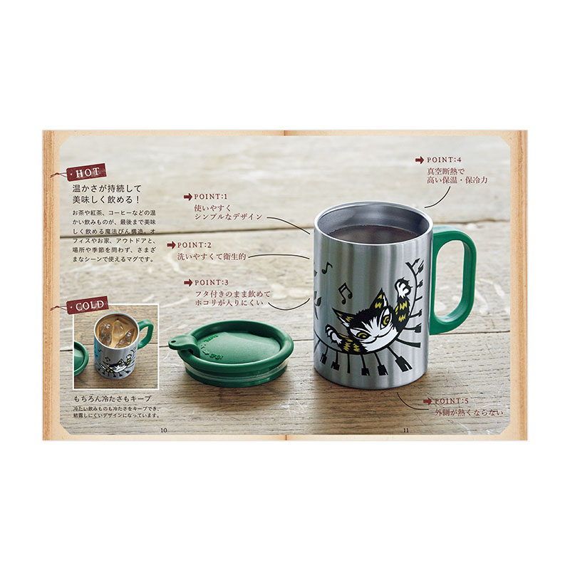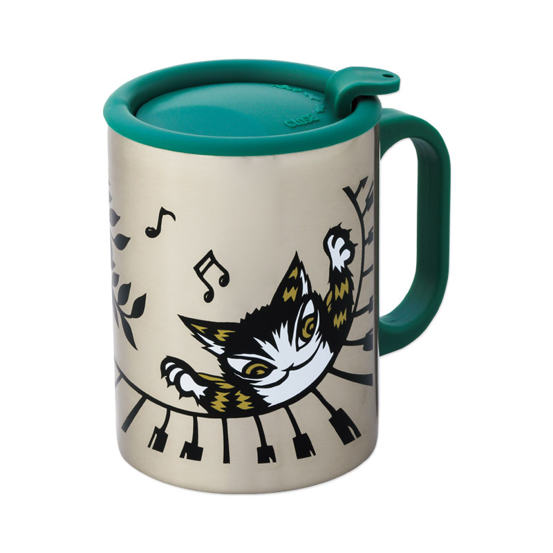 作家・池田あきこが手がける「猫のダヤン」の真空断熱ステンレスマグが登場!マグにはピアノを弾くダヤンのイラストをあしらって、可愛くも大人っぽいデザインに仕上げました。真空断熱で長時間温かさが持続するだけでなく、外側が熱くならず、フタを付けたままでも飲める便利なマグです。もちろん冷たいドリンクも冷たさをキープし、結露もしにくいすぐれもの。季節を問わず使える、便利で可愛いステンレスマグです。