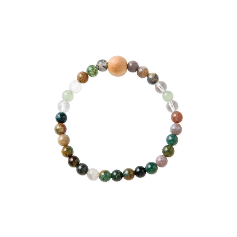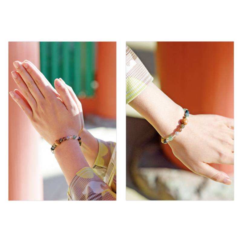 2015年に開創1200年を迎えた高野山。これに際して再建された「伽藍中門」には、高野山で大切に守り育てられた「高野霊木(R)」と称される材木が用いられました。この樹齢300余年という大変貴重なご用材の檜そのものを使用した珠(1珠)を天然石(ジャスパー、本水晶、アベンチュリン)とともに仕立てたブレスレットは、本誌だけで手に入れられる数量限定品。付属のブックレット『とっておきの高野山』では、聖地・高野山の魅力を凝縮してご案内します。