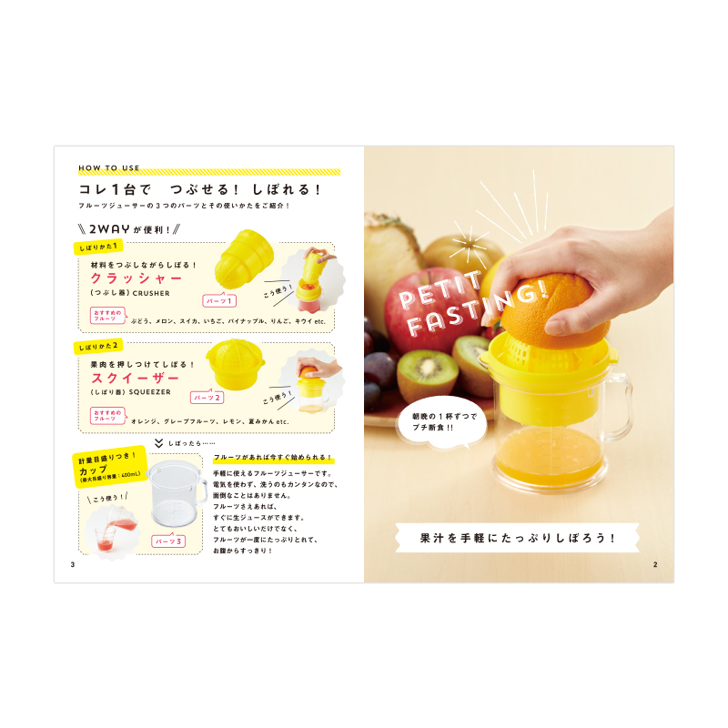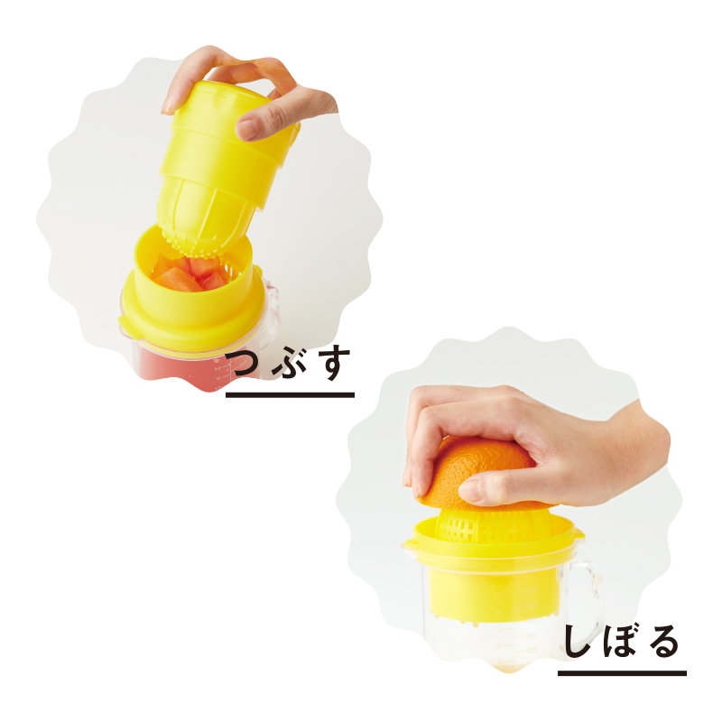 ダイエットやプチ断食に効くと評判のフルーツからフレッシュジュースが簡単&手軽に作れる2WAYジューサーです。芸能人やハリウッドセレブに人気のジュースダイエットが自宅でできます。グレープフルーツをはじめ、イチゴやキウイなどのフルーツ類を使ったフレッシュジュースがしぼるだけで完成!しぼり器は、凹凸のある円形に半分にしたフルーツを押し当ててしぼるタイプと、ザル状の器に果肉を入れて、こすように果汁をしぼる便利な2WAYタイプ。電気も必要ないうえ、お手入れも簡単で節電・時短にもピッタリ。フルーツジューサーを使用したオリジナルレシピつきです。