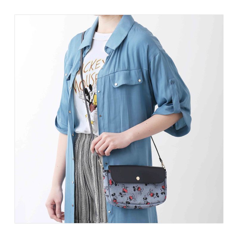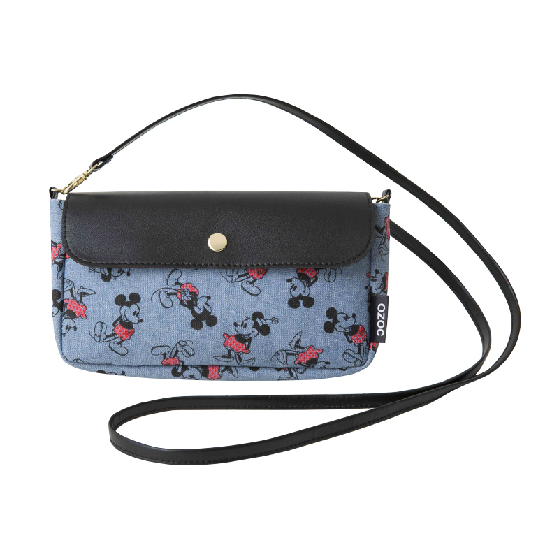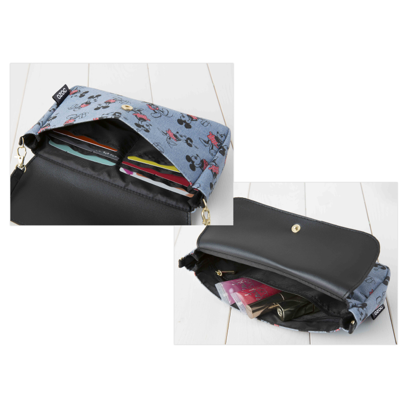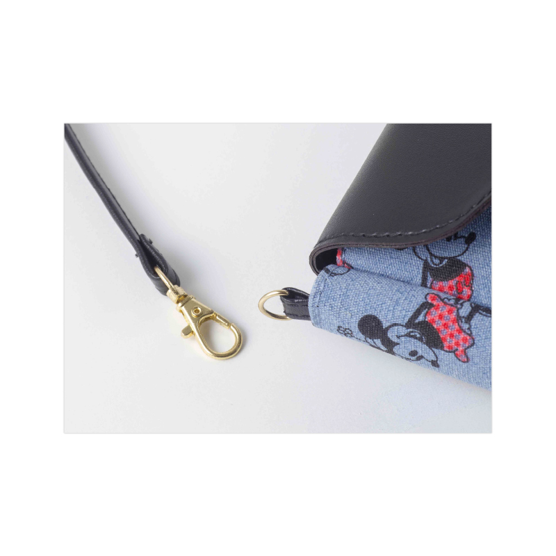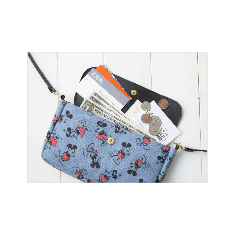 人気急上昇中のお財布バッグに、ミッキー&ミニーデザインが登場!デザインは本誌限定のギンガムチェックの衣装を着たミッキー&ミニーを総柄であしらいました。合わせやすいデニム風カラーがおしゃれ!内側には6つのカードポケットとファスナーポケットがついており、機能性もバツグン!お財布にもポーチにもポシェットにもなる大人気アイテムです。